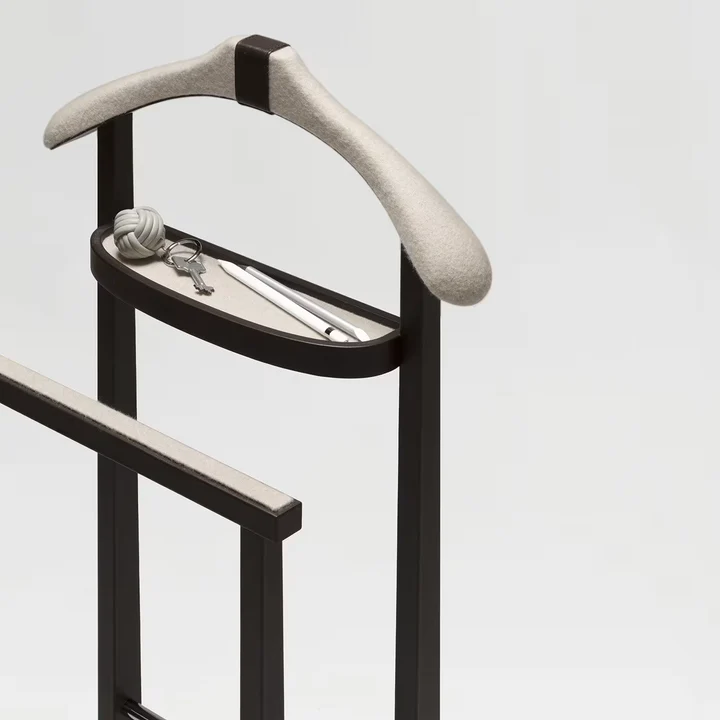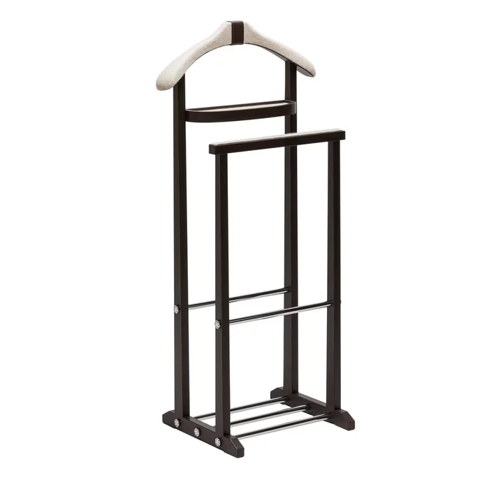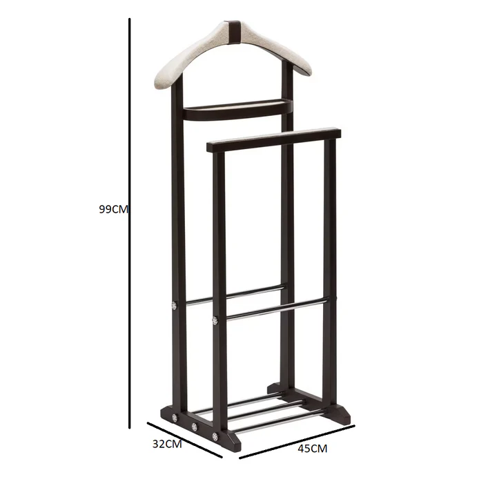 This elegant clothes rack seamlessly combines modern design with practical functionality. Crafted from a mix of durable metal, soft fabric, and natural wood accents, it offers both strength and aesthetic appeal. With dimensions of 45 cm in width, 32 cm in depth, and 99 cm in height, it provides ample space for neatly organizing clothes and accessories. The sophisticated black frame with white details adds a stylish contrast, making it a perfect addition to bedrooms, dressing areas, or entryways seeking a refined and contemporary look.