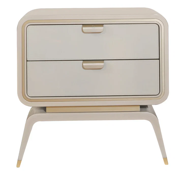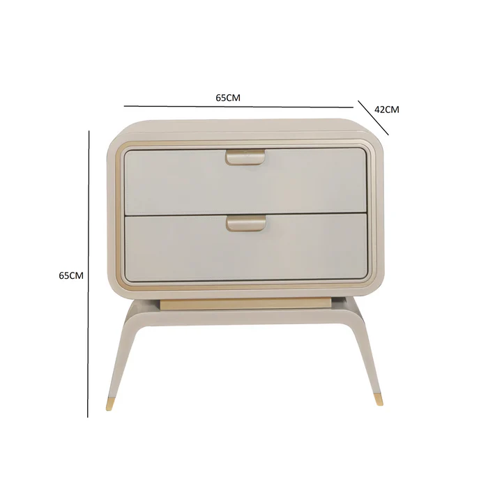 This distinctive nightstand blends elegance and practicality in a refined modern design. Crafted from high-quality natural wood with subtle metal details, it ensures durability and timeless appeal. The warm beige tone complemented by golden accents adds a touch of luxury and sophistication to any bedroom. With its ideal dimensions, it offers ample storage while enhancing the aesthetic of both classic and contemporary interiors.