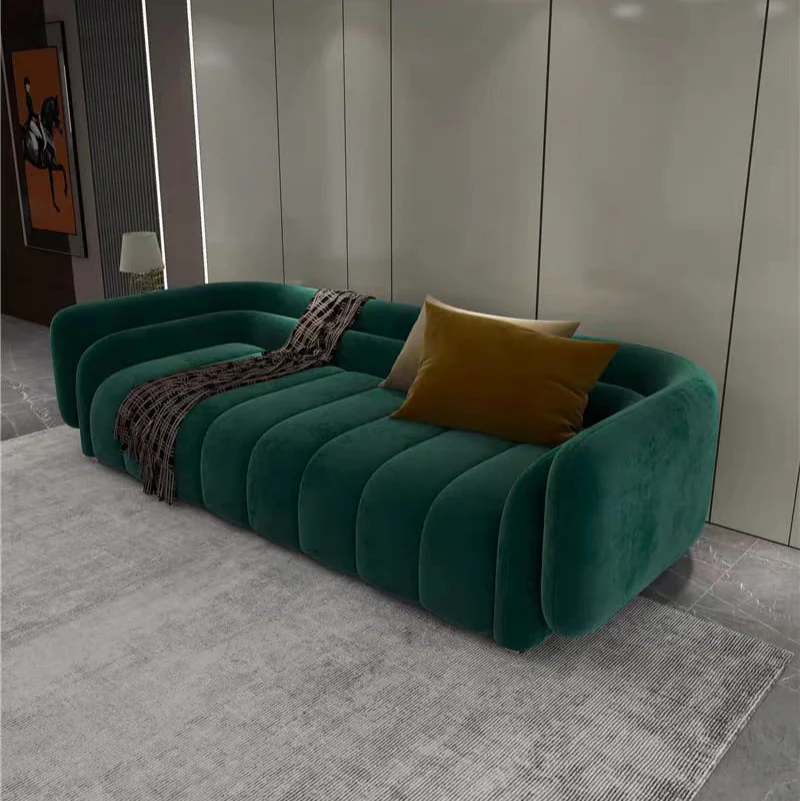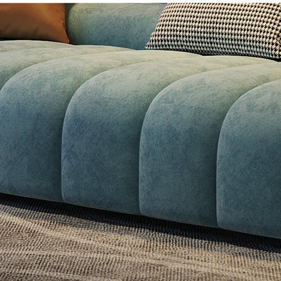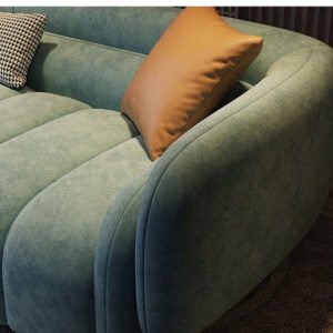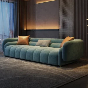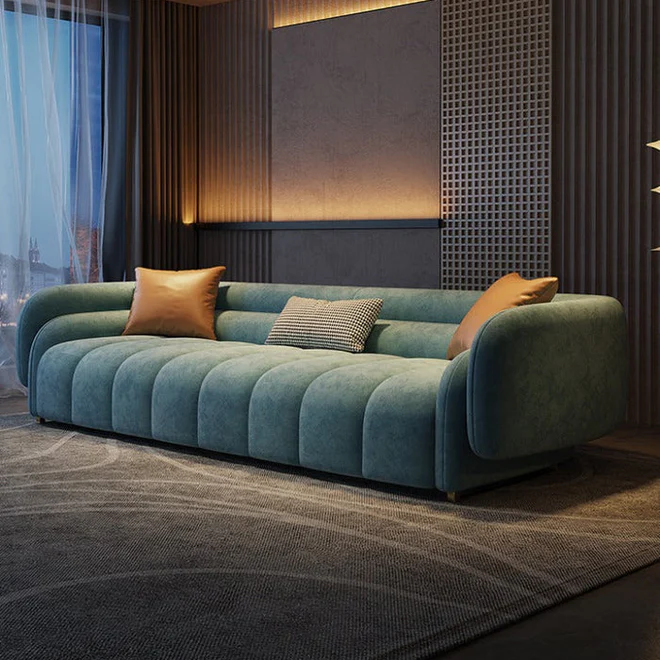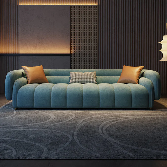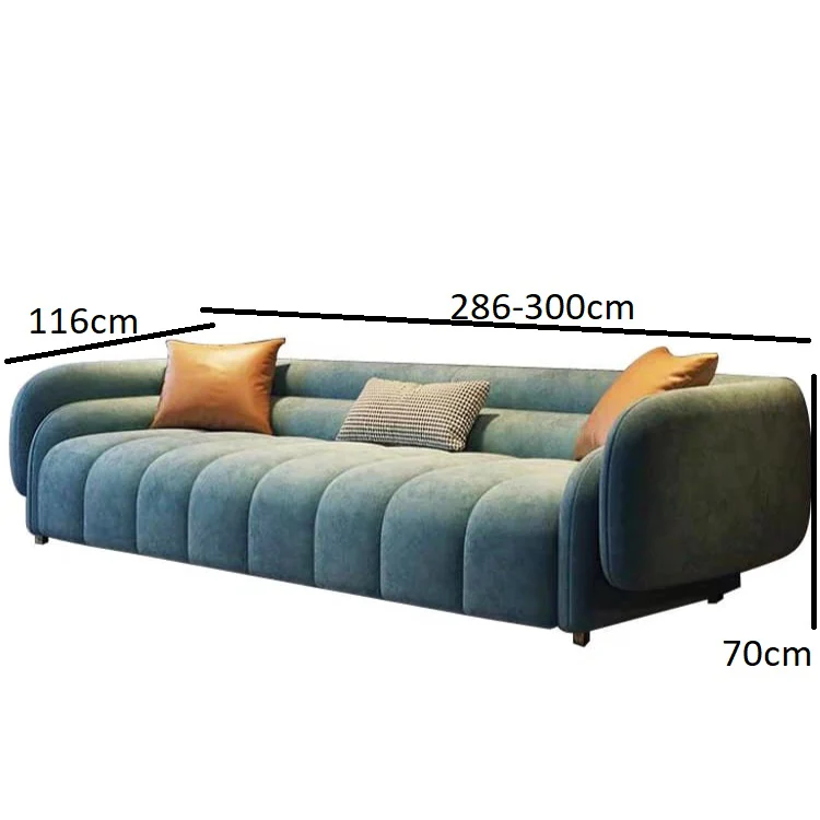 - A modern sofa with an elegant and luxurious design, perfect for spacious living areas. It features a sturdy frame made of natural wood and soft fabric upholstery in an attractive blue color, adding a touch of vibrancy and modernity to your décor. The sofa’s large size is ideal for family gatherings, providing a comfortable and sophisticated seating experience.